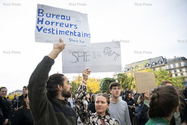 Légende : Encadre par un important dispositif policier, des centaines de clients font la queue rue de Rivoli a Paris pour acceder a la boutique Shein du BHV. C'est la premiere fois que le geant chinois de l'e-commerce ouvre une boutique physique et perenne dans le monde. De l'autre cote de la rue, quelques dizaines de manifestants protestent contre le modele social et environnemental de cette marque d'ultra fast fashion. Le 05/11/2025 /// Surrounded by a large police presence, hundreds of customers queued on Rue de Rivoli in Paris to enter the Shein store in the BHV department store. This is the first time the Chinese e-commerce giant has opened a permanent physical store anywhere in the world. Across the street, a few dozen protesters demonstrated against the social and environmental model of this ultra-fast fashion brand. On November 5, 2025 /// PHOTO Vincent Boisot