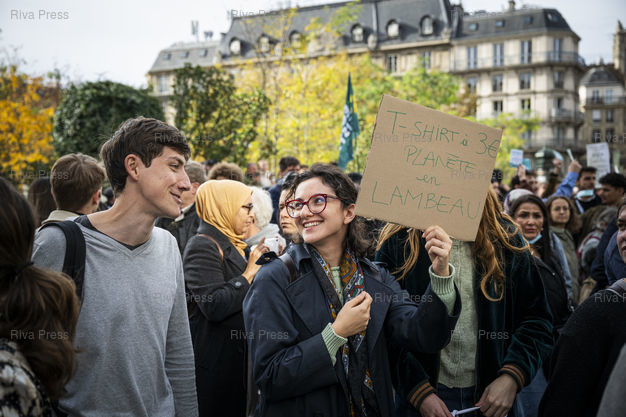 Légende : Encadre par un important dispositif policier, des centaines de clients font la queue rue de Rivoli a Paris pour acceder a la boutique Shein du BHV. C'est la premiere fois que le geant chinois de l'e-commerce ouvre une boutique physique et perenne dans le monde. De l'autre cote de la rue, quelques dizaines de manifestants protestent contre le modele social et environnemental de cette marque d'ultra fast fashion. Le 05/11/2025 /// Surrounded by a large police presence, hundreds of customers queued on Rue de Rivoli in Paris to enter the Shein store in the BHV department store. This is the first time the Chinese e-commerce giant has opened a permanent physical store anywhere in the world. Across the street, a few dozen protesters demonstrated against the social and environmental model of this ultra-fast fashion brand. On November 5, 2025 /// PHOTO Vincent Boisot
