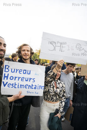 Légende : Encadre par un important dispositif policier, des centaines de clients font la queue rue de Rivoli a Paris pour acceder a la boutique Shein du BHV. C'est la premiere fois que le geant chinois de l'e-commerce ouvre une boutique physique et perenne dans le monde. De l'autre cote de la rue, quelques dizaines de manifestants protestent contre le modele social et environnemental de cette marque d'ultra fast fashion. Le 05/11/2025 /// Surrounded by a large police presence, hundreds of customers queued on Rue de Rivoli in Paris to enter the Shein store in the BHV department store. This is the first time the Chinese e-commerce giant has opened a permanent physical store anywhere in the world. Across the street, a few dozen protesters demonstrated against the social and environmental model of this ultra-fast fashion brand. On November 5, 2025 /// PHOTO Vincent Boisot