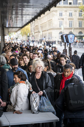 Légende : Encadre par un important dispositif policier, des centaines de clients font la queue rue de Rivoli a Paris pour acceder a la boutique Shein du BHV. C'est la premiere fois que le geant chinois de l'e-commerce ouvre une boutique physique et perenne dans le monde. De l'autre cote de la rue, quelques dizaines de manifestants protestent contre le modele social et environnemental de cette marque d'ultra fast fashion. Le 05/11/2025 /// Surrounded by a large police presence, hundreds of customers queued on Rue de Rivoli in Paris to enter the Shein store in the BHV department store. This is the first time the Chinese e-commerce giant has opened a permanent physical store anywhere in the world. Across the street, a few dozen protesters demonstrated against the social and environmental model of this ultra-fast fashion brand. On November 5, 2025 /// PHOTO Vincent Boisot