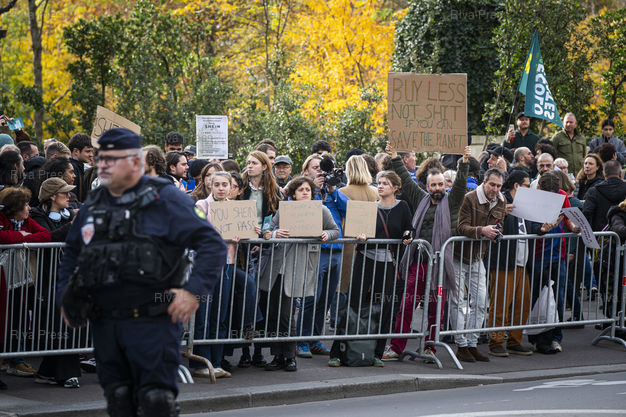 Légende : Encadre par un important dispositif policier, des centaines de clients font la queue rue de Rivoli a Paris pour acceder a la boutique Shein du BHV. C'est la premiere fois que le geant chinois de l'e-commerce ouvre une boutique physique et perenne dans le monde. De l'autre cote de la rue, quelques dizaines de manifestants protestent contre le modele social et environnemental de cette marque d'ultra fast fashion. Le 05/11/2025 /// Surrounded by a large police presence, hundreds of customers queued on Rue de Rivoli in Paris to enter the Shein store in the BHV department store. This is the first time the Chinese e-commerce giant has opened a permanent physical store anywhere in the world. Across the street, a few dozen protesters demonstrated against the social and environmental model of this ultra-fast fashion brand. On November 5, 2025 /// PHOTO Vincent Boisot