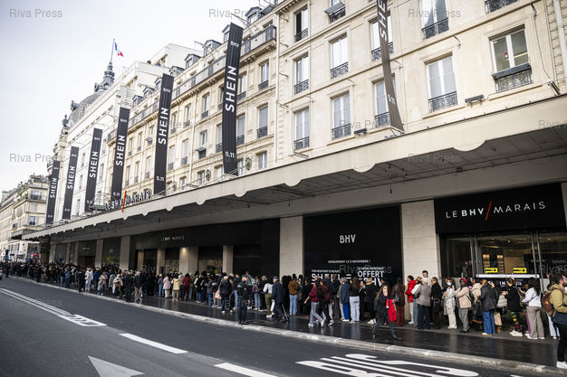 Légende : Encadre par un important dispositif policier, des centaines de clients font la queue rue de Rivoli a Paris pour acceder a la boutique Shein du BHV. C'est la premiere fois que le geant chinois de l'e-commerce ouvre une boutique physique et perenne dans le monde. De l'autre cote de la rue, quelques dizaines de manifestants protestent contre le modele social et environnemental de cette marque d'ultra fast fashion. Le 05/11/2025 /// Surrounded by a large police presence, hundreds of customers queued on Rue de Rivoli in Paris to enter the Shein store in the BHV department store. This is the first time the Chinese e-commerce giant has opened a permanent physical store anywhere in the world. Across the street, a few dozen protesters demonstrated against the social and environmental model of this ultra-fast fashion brand. On November 5, 2025 /// PHOTO Vincent Boisot
