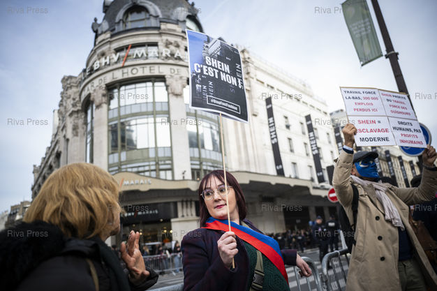 Légende : Encadre par un important dispositif policier, des centaines de clients font la queue rue de Rivoli a Paris pour acceder a la boutique Shein du BHV. C'est la premiere fois que le geant chinois de l'e-commerce ouvre une boutique physique et perenne dans le monde. De l'autre cote de la rue, quelques dizaines de manifestants protestent contre le modele social et environnemental de cette marque d'ultra fast fashion. Le 05/11/2025 /// Surrounded by a large police presence, hundreds of customers queued on Rue de Rivoli in Paris to enter the Shein store in the BHV department store. This is the first time the Chinese e-commerce giant has opened a permanent physical store anywhere in the world. Across the street, a few dozen protesters demonstrated against the social and environmental model of this ultra-fast fashion brand. On November 5, 2025 /// PHOTO Vincent Boisot