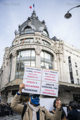 Légende : Encadre par un important dispositif policier, des centaines de clients font la queue rue de Rivoli a Paris pour acceder a la boutique Shein du BHV. C'est la premiere fois que le geant chinois de l'e-commerce ouvre une boutique physique et perenne dans le monde. De l'autre cote de la rue, quelques dizaines de manifestants protestent contre le modele social et environnemental de cette marque d'ultra fast fashion. Le 05/11/2025 /// Surrounded by a large police presence, hundreds of customers queued on Rue de Rivoli in Paris to enter the Shein store in the BHV department store. This is the first time the Chinese e-commerce giant has opened a permanent physical store anywhere in the world. Across the street, a few dozen protesters demonstrated against the social and environmental model of this ultra-fast fashion brand. On November 5, 2025 /// PHOTO Vincent Boisot