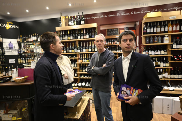 Légende : Gabriel Attal, Secrétaire général de Renaissance, et Pierre-Yves Bournazel, candidat à la mairie de Paris, rencontrent les commerçants et habitants du 18eme arrondissement /// Gabriel Attal, Secretary General of Renaissance, and Pierre-Yves Bournazel, candidate for mayor of Paris, meet with shopkeepers and residents of the 18th arrondissement - Paris - 08/11/2025 - Photo © Lionel Préau +33 (0)6 68 12 83 77