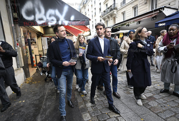 Légende : Gabriel Attal, Secrétaire général de Renaissance, et Pierre-Yves Bournazel, candidat à la mairie de Paris, rencontrent les commerçants et habitants du 18eme arrondissement /// Gabriel Attal, Secretary General of Renaissance, and Pierre-Yves Bournazel, candidate for mayor of Paris, meet with shopkeepers and residents of the 18th arrondissement - Paris - 08/11/2025 - Photo © Lionel Préau +33 (0)6 68 12 83 77