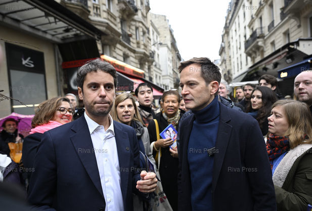 Légende : Gabriel Attal, Secrétaire général de Renaissance, et Pierre-Yves Bournazel, candidat à la mairie de Paris, rencontrent les commerçants et habitants du 18eme arrondissement /// Gabriel Attal, Secretary General of Renaissance, and Pierre-Yves Bournazel, candidate for mayor of Paris, meet with shopkeepers and residents of the 18th arrondissement - Paris - 08/11/2025 - Photo © Lionel Préau +33 (0)6 68 12 83 77