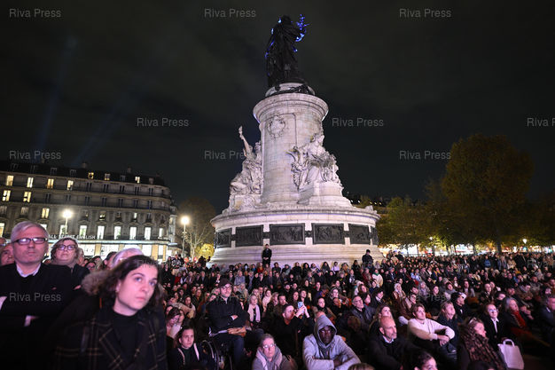 Légende : Dix ans après les attentats du 13 novembre 2015, les plus meurtriers jamais perpétrés en France, des parisiens se rassemblent Place de la République pour suivre la cérémonie d'hommage retransmise sur grand écran /// Ten years after the November 13, 2015 attacks, the deadliest ever perpetrated in France, Parisians gathered at Place de la République to watch the memorial ceremony broadcast on a large screen - Paris - 13/11/2025 - Photo © Lionel Préau +33 (0)6 68 12 83 77