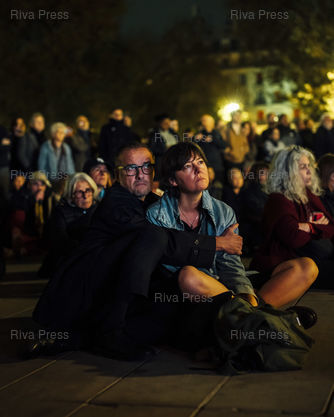 Légende : Plusieurs milliers de Parisiens se rassemblent sur la place de la République, à Paris, pour assister à la retransmission de la cérémonie de commémoration des dix ans des attentas du 13 novembre 2015. 13 novembre 2025. © Lucien Lung / Riva-Press *** Several thousand Parisians gathered in the Place de la République in Paris to watch the live broadcast of the ceremony commemorating the tenth anniversary of the November 13, 2015 attacks. November 13, 2025. © Lucien Lung / Riva-Press
