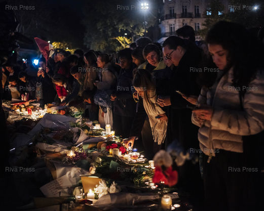 Légende : Des parisiens déposent des fleurs et des bougies lors de la commémoration des 10 ans des attentats du 13 novembre, place de la Republique, a Paris, le 13 novembre 2025. © Lucien Lung / Riva-Press *** Parisians lay flowers and candles during the commemoration of the 10th anniversary of the November 13 attacks, at Place de la République, Paris, on November 13, 2025. © Lucien Lung / Riva-Press