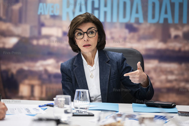 Légende : Rachida Dati, candidate au poste de Maire de Paris pour les elections municipales de 2026, repond aux questions de journalistes dans son QG de campagne du 12eme arrondissement de la capitale. Le 21/11/2025 /// Rachida Dati, candidate for Mayor of Paris in the 2026 municipal elections, answers journalists' questions at her campaign headquarters in the 12th arrondissement of the capital. On November 21, 2025 /// PHOTO Vincent Boisot