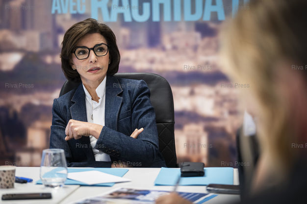 Légende : Rachida Dati, candidate au poste de Maire de Paris pour les elections municipales de 2026, repond aux questions de journalistes dans son QG de campagne du 12eme arrondissement de la capitale. Le 21/11/2025 /// Rachida Dati, candidate for Mayor of Paris in the 2026 municipal elections, answers journalists' questions at her campaign headquarters in the 12th arrondissement of the capital. On November 21, 2025 /// PHOTO Vincent Boisot