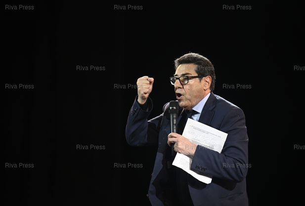 Légende : Bernard Cazeneuve, ancien premier ministre, réunit la "gauche de gouvernement" lors d'une réunion de son mouvement "La Convention" avec l'objectif d'offrir une alternative à l'extrême droite. Philippe Aghion, prix Nobel d’économie /// Bernard Cazeneuve, former prime minister, is bringing together the "governing left" at a meeting of his movement "La Convention" with the aim of offering an alternative to the far right. Philippe Aghion, Nobel Prize winners in economics - Pontoise - 16/11/2025 - Photo © Lionel Préau +33 (0)6 68 12 83 77
