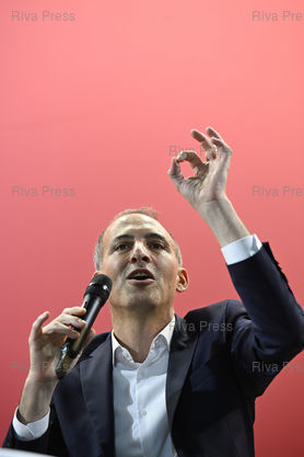 Légende : Bernard Cazeneuve, ancien premier ministre, réunit la "gauche de gouvernement" lors d'une réunion de son mouvement "La Convention" avec l'objectif d'offrir une alternative à l'extrême droite. Raphaël Glucksmann, député européen /// Bernard Cazeneuve, former prime minister, is bringing together the "governing left" at a meeting of his movement "La Convention" with the aim of offering an alternative to the far right. Raphaël Glucksmann, MEP - Pontoise - 16/11/2025 - Photo © Lionel Préau +33 (0)6 68 12 83 77
