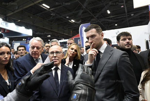 Légende : Jordan Bardella, président du Rassemblement national, visite le salon Milipol, salon professionnel consacré à la sécurité intérieure des États. Avec Eric Ciotti, président de l'UDR. Demonstration de gants Taser à impulsion électriques /// Jordan Bardella, president of the Rassemblement National, visits the Milipol trade fair, a professional exhibition dedicated to the internal security of states. With Eric Ciotti, President of the UDR (Union of the Right for the Republic). Demonstration of electric pulse Taser gloves - Villepinte - 19/11/2025 - Photo © Lionel Préau +33 (0)6 68 12 83 77