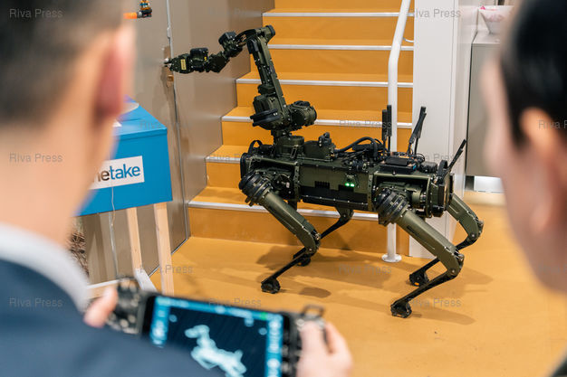 Milipol Paris est le plus grand evenement mondial consacre a la securite interieure (armes, armements, munitions, equipements de protection et equipements pour la police et les forces armees). Villepinte, 21 novembre 2025. Teo Manisier / Riva Press /// A four-legged robot dog at the booth of American manufacturer Ghostrobotics at the 24th edition of the international exhibition on internal security in the United States--MILIPOL PARIS 2025, at the Paris-Nord-Villepinte Exhibition Center.