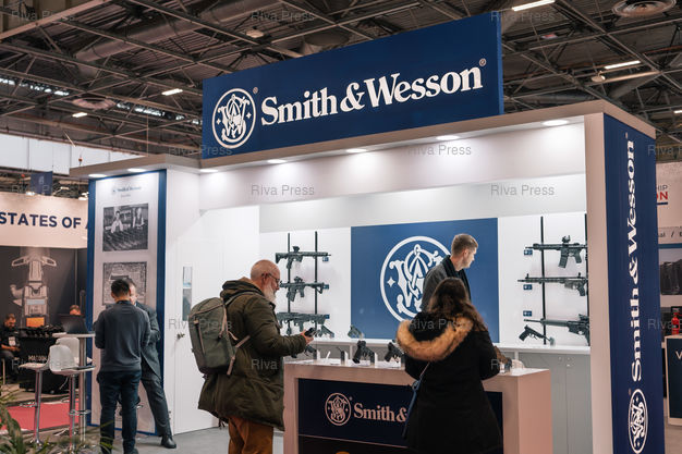 Légende : Le stand du fabricant d'armement americain Smith & Wesson a la 24e édition du salon international de la securite interieure des Etats - MILIPOL PARIS 2025, au Parc des Expositions de Paris-Nord-Villepinte.