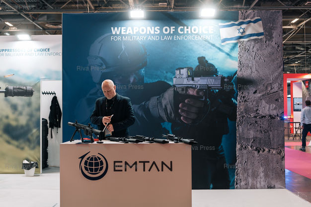 Légende : Le stand du fabricant d'armes israelien Emtan a la 24e édition du salon international de la securite interieure des Etats - MILIPOL PARIS 2025, au Parc des Expositions de Paris-Nord-Villepinte.