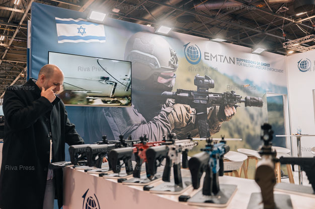 Légende : Le stand du fabricant d'armes israelien Emtan a la 24e édition du salon international de la securite interieure des Etats - MILIPOL PARIS 2025, au Parc des Expositions de Paris-Nord-Villepinte.