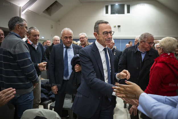 Légende : Dans le cadre d'un deplacement de deux jours en Eure-et-Loire, le president des Republicains Bruno Retailleau participe a une reunion publique devant quelques centaines de sympathisants a l'Espace Hugo de Cherisy, pres de Dreux. Le 20/11/2025 // During a two-day trip to Eure-et-Loire, the president of Les Republicains, Bruno Retailleau, is participating in a public meeting in front of a few hundred supporters at the Espace Hugo in Cherisy, near Dreux. On November 20, 2025 /// PHOTO Vincent Boisot