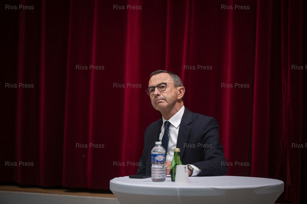 Légende : Dans le cadre d'un deplacement de deux jours en Eure-et-Loire, le president des Republicains Bruno Retailleau participe a une reunion publique devant quelques centaines de sympathisants a l'Espace Hugo de Cherisy, pres de Dreux. Le 20/11/2025 // During a two-day trip to Eure-et-Loire, the president of Les Republicains, Bruno Retailleau, is participating in a public meeting in front of a few hundred supporters at the Espace Hugo in Cherisy, near Dreux. On November 20, 2025 /// PHOTO Vincent Boisot