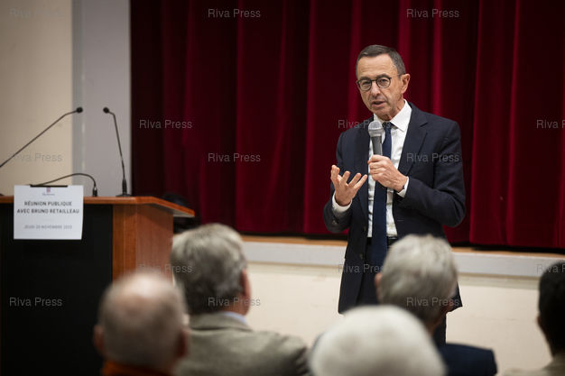 Légende : Dans le cadre d'un deplacement de deux jours en Eure-et-Loire, le president des Republicains Bruno Retailleau participe a une reunion publique devant quelques centaines de sympathisants a l'Espace Hugo de Cherisy, pres de Dreux. Le 20/11/2025 // During a two-day trip to Eure-et-Loire, the president of Les Republicains, Bruno Retailleau, is participating in a public meeting in front of a few hundred supporters at the Espace Hugo in Cherisy, near Dreux. On November 20, 2025 /// PHOTO Vincent Boisot