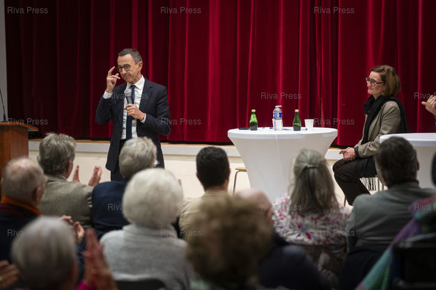 Légende : Dans le cadre d'un deplacement de deux jours en Eure-et-Loire, le president des Republicains Bruno Retailleau participe a une reunion publique devant quelques centaines de sympathisants a l'Espace Hugo de Cherisy, pres de Dreux. A ses cotes, la deputee LR de la circonscription Christelle Minard qui a pris la succession d'Olivier Marleix. Le 20/11/2025 // During a two-day trip to Eure-et-Loire, the president of Les Republicains, Bruno Retailleau, is participating in a public meeting in front of a few hundred supporters at the Espace Hugo in Cherisy, near Dreux. On November 20, 2025 /// PHOTO Vincent Boisot