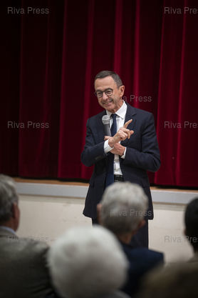Légende : Dans le cadre d'un deplacement de deux jours en Eure-et-Loire, le president des Republicains Bruno Retailleau participe a une reunion publique devant quelques centaines de sympathisants a l'Espace Hugo de Cherisy, pres de Dreux. Le 20/11/2025 // During a two-day trip to Eure-et-Loire, the president of Les Republicains, Bruno Retailleau, is participating in a public meeting in front of a few hundred supporters at the Espace Hugo in Cherisy, near Dreux. On November 20, 2025 /// PHOTO Vincent Boisot