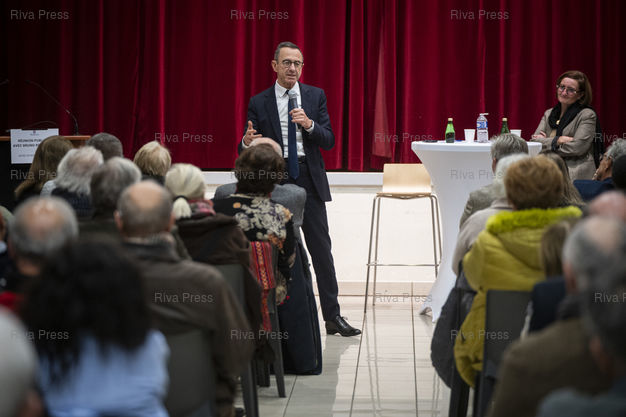 Légende : Dans le cadre d'un deplacement de deux jours en Eure-et-Loire, le president des Republicains Bruno Retailleau participe a une reunion publique devant quelques centaines de sympathisants a l'Espace Hugo de Cherisy, pres de Dreux. Le 20/11/2025 // During a two-day trip to Eure-et-Loire, the president of Les Republicains, Bruno Retailleau, is participating in a public meeting in front of a few hundred supporters at the Espace Hugo in Cherisy, near Dreux. On November 20, 2025 /// PHOTO Vincent Boisot
