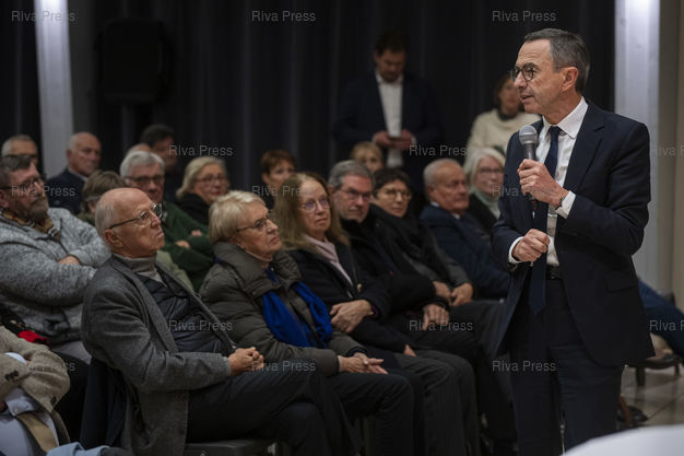Légende : Dans le cadre d'un deplacement de deux jours en Eure-et-Loire, le president des Republicains Bruno Retailleau participe a une reunion publique devant quelques centaines de sympathisants a l'Espace Hugo de Cherisy, pres de Dreux. Le 20/11/2025 // During a two-day trip to Eure-et-Loire, the president of Les Republicains, Bruno Retailleau, is participating in a public meeting in front of a few hundred supporters at the Espace Hugo in Cherisy, near Dreux. On November 20, 2025 /// PHOTO Vincent Boisot