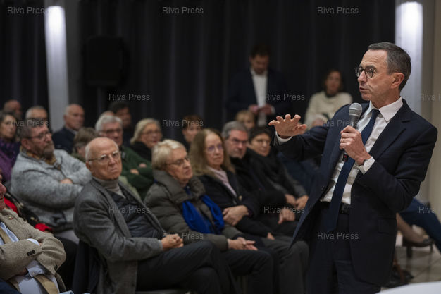Légende : Dans le cadre d'un deplacement de deux jours en Eure-et-Loire, le president des Republicains Bruno Retailleau participe a une reunion publique devant quelques centaines de sympathisants a l'Espace Hugo de Cherisy, pres de Dreux. Le 20/11/2025 // During a two-day trip to Eure-et-Loire, the president of Les Republicains, Bruno Retailleau, is participating in a public meeting in front of a few hundred supporters at the Espace Hugo in Cherisy, near Dreux. On November 20, 2025 /// PHOTO Vincent Boisot