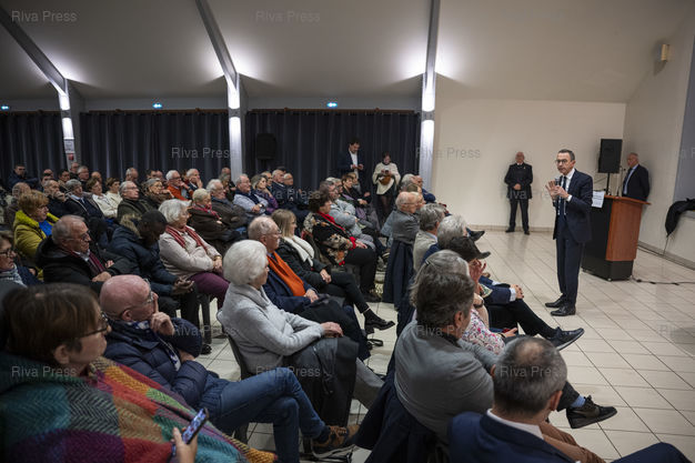 Légende : Dans le cadre d'un deplacement de deux jours en Eure-et-Loire, le president des Republicains Bruno Retailleau participe a une reunion publique devant quelques centaines de sympathisants a l'Espace Hugo de Cherisy, pres de Dreux. Le 20/11/2025 // During a two-day trip to Eure-et-Loire, the president of Les Republicains, Bruno Retailleau, is participating in a public meeting in front of a few hundred supporters at the Espace Hugo in Cherisy, near Dreux. On November 20, 2025 /// PHOTO Vincent Boisot
