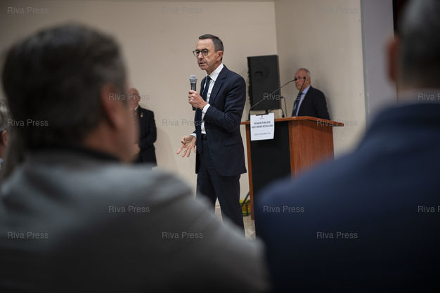 Légende : Dans le cadre d'un deplacement de deux jours en Eure-et-Loire, le president des Republicains Bruno Retailleau participe a une reunion publique devant quelques centaines de sympathisants a l'Espace Hugo de Cherisy, pres de Dreux. Le 20/11/2025 // During a two-day trip to Eure-et-Loire, the president of Les Republicains, Bruno Retailleau, is participating in a public meeting in front of a few hundred supporters at the Espace Hugo in Cherisy, near Dreux. On November 20, 2025 /// PHOTO Vincent Boisot