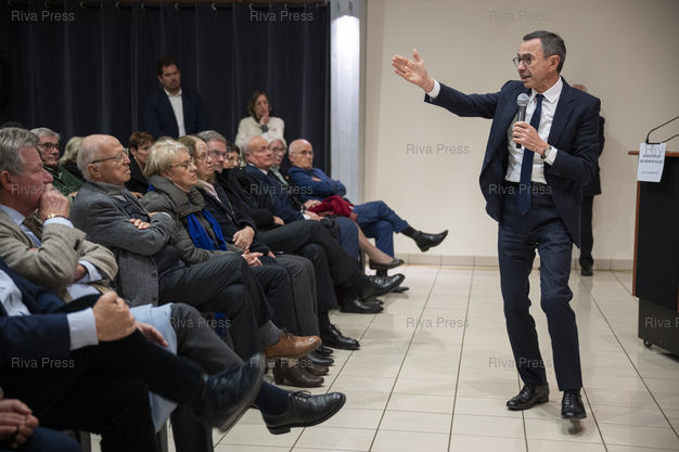 Légende : Dans le cadre d'un deplacement de deux jours en Eure-et-Loire, le president des Republicains Bruno Retailleau participe a une reunion publique devant quelques centaines de sympathisants a l'Espace Hugo de Cherisy, pres de Dreux. Le 20/11/2025 // During a two-day trip to Eure-et-Loire, the president of Les Republicains, Bruno Retailleau, is participating in a public meeting in front of a few hundred supporters at the Espace Hugo in Cherisy, near Dreux. On November 20, 2025 /// PHOTO Vincent Boisot
