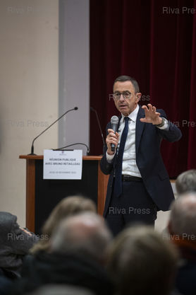 Légende : Dans le cadre d'un deplacement de deux jours en Eure-et-Loire, le president des Republicains Bruno Retailleau participe a une reunion publique devant quelques centaines de sympathisants a l'Espace Hugo de Cherisy, pres de Dreux. Le 20/11/2025 // During a two-day trip to Eure-et-Loire, the president of Les Republicains, Bruno Retailleau, is participating in a public meeting in front of a few hundred supporters at the Espace Hugo in Cherisy, near Dreux. On November 20, 2025 /// PHOTO Vincent Boisot