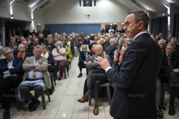 Légende : Dans le cadre d'un deplacement de deux jours en Eure-et-Loire, le president des Republicains Bruno Retailleau participe a une reunion publique devant quelques centaines de sympathisants a l'Espace Hugo de Cherisy, pres de Dreux. Le 20/11/2025 // During a two-day trip to Eure-et-Loire, the president of Les Republicains, Bruno Retailleau, is participating in a public meeting in front of a few hundred supporters at the Espace Hugo in Cherisy, near Dreux. On November 20, 2025 /// PHOTO Vincent Boisot