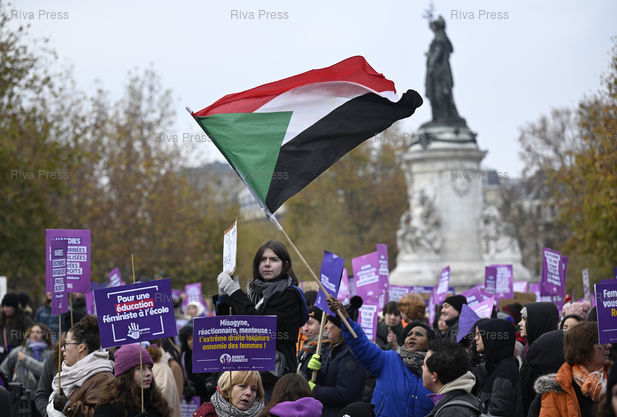 Légende : Manifestation à l'occasion de la Journée internationale de lutte contre les violences faites aux femmes, alors que le nombre de féminicides conjugaux a augmenté de 11 % entre 2023 et 2024, avec 107 femmes tuées par leur conjoint ou ex-conjoint. Manifestante portant un drapeau palestinien /// Demonstration on the occasion of the International Day for the Elimination of Violence against Women, at a time when the number of domestic femicides increased by 11% between 2023 and 2024, with 107 women killed by their partner or ex-partner. Protester carrying a Palestinian flag - Paris - 22/11/2025 - Photo © Lionel Préau +33 (0)6 68 12 83 77
