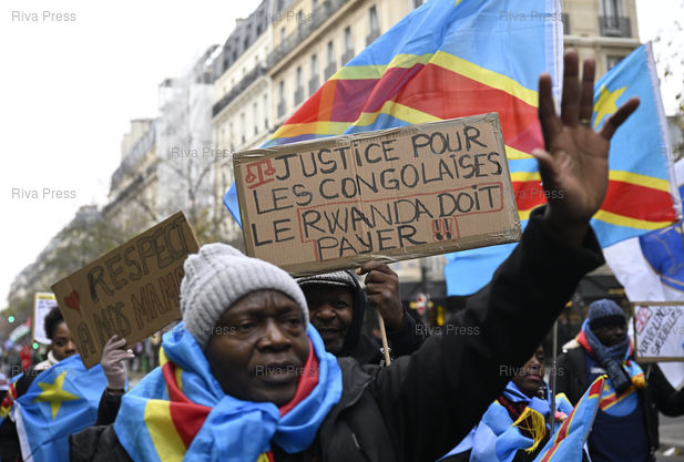 Légende : Manifestation à l'occasion de la Journée internationale de lutte contre les violences faites aux femmes, alors que le nombre de féminicides conjugaux a augmenté de 11 % entre 2023 et 2024, avec 107 femmes tuées par leur conjoint ou ex-conjoint. "Justice pour les congolaises. Le Rwanda doit payer" /// Demonstration on the occasion of the International Day for the Elimination of Violence against Women, at a time when the number of domestic femicides increased by 11% between 2023 and 2024, with 107 women killed by their partner or ex-partner. "Justice for Congolese women. Rwanda must pay." - Paris - 22/11/2025 - Photo © Lionel Préau +33 (0)6 68 12 83 77