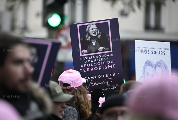 Légende : Manifestation à l'occasion de la Journée internationale de lutte contre les violences faites aux femmes, alors que le nombre de féminicides conjugaux a augmenté de 11 % entre 2023 et 2024, avec 107 femmes tuées par leur conjoint ou ex-conjoint. En fin de manifestation, encadré par la poilice, le collectif d'identitaires d'extrême droite Némésis, qui se revendique féministe, brandit des portraits de députés LFI /// Demonstration on the occasion of the International Day for the Elimination of Violence against Women, at a time when the number of domestic femicides increased by 11% between 2023 and 2024, with 107 women killed by their partner or ex-partner. At the end of the demonstration, supervised by the police, the far-right identity collective Nemesis, which claims to be feminist, brandished portraits of La Fra,nce Insoumise MPs - Paris - 22/11/2025 - Photo © Lionel Préau +33 (0)6 68 12 83 77