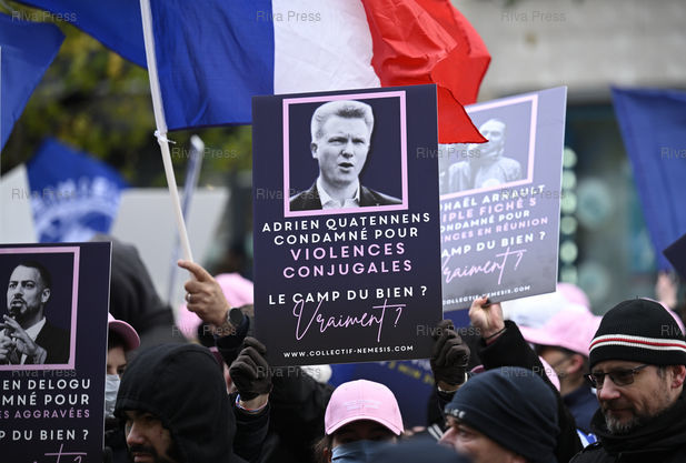 Légende : Manifestation à l'occasion de la Journée internationale de lutte contre les violences faites aux femmes, alors que le nombre de féminicides conjugaux a augmenté de 11 % entre 2023 et 2024, avec 107 femmes tuées par leur conjoint ou ex-conjoint. En fin de manifestation, encadré par la poilice, le collectif d'identitaires d'extrême droite Némésis, qui se revendique féministe, brandit des portraits de députés LFI /// Demonstration on the occasion of the International Day for the Elimination of Violence against Women, at a time when the number of domestic femicides increased by 11% between 2023 and 2024, with 107 women killed by their partner or ex-partner. At the end of the demonstration, supervised by the police, the far-right identity collective Nemesis, which claims to be feminist, brandished portraits of La Fra,nce Insoumise MPs - Paris - 22/11/2025 - Photo © Lionel Préau +33 (0)6 68 12 83 77