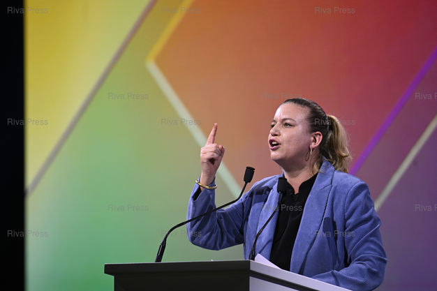 Légende : La France Insoumise lance sa campagne pour les élections municipales de 2026 lors d'une Convention. Mathilde Panot, présidente du groupe LFI à l’Assemblée nationale /// La France Insoumise launches its campaign for the 2026 municipal elections at a Convention. Mathilde Panot, president of the LFI group in the National Assembly - Aubervilliers - 23/11/2025 - Photo © Lionel Préau +33 (0)6 68 12 83 77