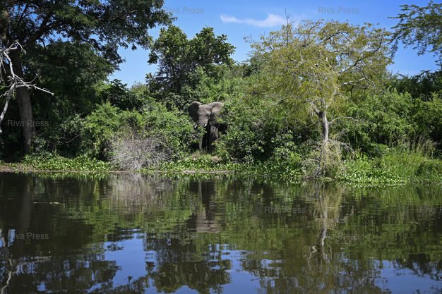 Légende : Des elephants viennent se rafraichir le long du Nil dans la zone protegee du Parc National de Murchison Falls en Ouganda ou le groupe francais TotalEnergies exploite un forage petrolier dans le cadre du projet d'extraction Tilenga. Le 07/11/2024 /// Elephants come to cool off along the Nile in the protected area of ??Murchison Falls National Park in Uganda, where the French group TotalEnergies is operating an oil well as part of the Tilenga extraction project. On November 7, 2024 /// PHOTO Vincent Boisot