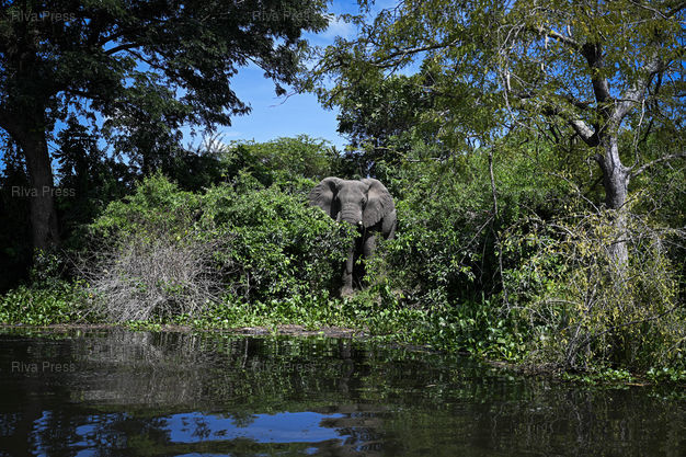Légende : Des elephants viennent se rafraichir le long du Nil dans la zone protegee du Parc National de Murchison Falls en Ouganda ou le groupe francais TotalEnergies exploite un forage petrolier dans le cadre du projet d'extraction Tilenga. Le 07/11/2024 /// Elephants come to cool off along the Nile in the protected area of ??Murchison Falls National Park in Uganda, where the French group TotalEnergies is operating an oil well as part of the Tilenga extraction project. On November 7, 2024 /// PHOTO Vincent Boisot
