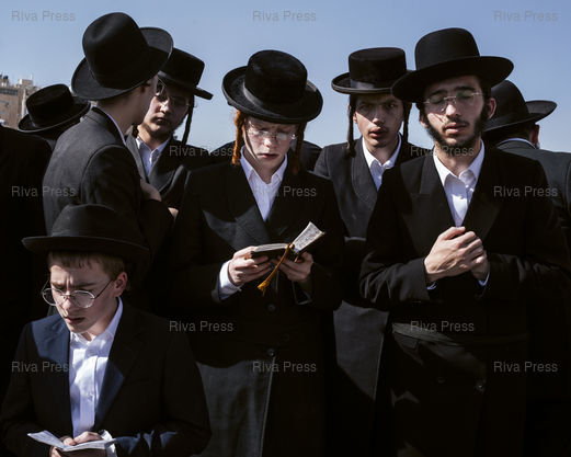 Légende : De jeunes ultra-orthodoxes prient lors d'un rassemblement contre le projet de loi les contraignant à la conscription militaire au sein de l'armée israélienne. Jérusalem, le 30 octobre 2025. © Lucien Lung / Riva Press *** Young ultra-Orthodox men pray during a rally against a bill that would force them into military service in the Israeli army. Jerusalem, October 30, 2025. © Lucien Lung / Riva Press