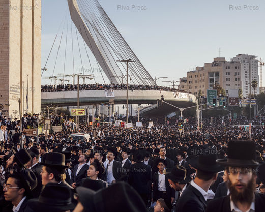 Légende : Plusieurs centaines de milliers d'ultra-orthodoxes se rassemblent à Jérusalem pour protester contre le projet de loi les contraignant à la conscription militaire au sein de l'armée israélienne. Jérusalem, le 30 octobre 2025. © Lucien Lung / Riva Press *** Several hundred thousand ultra-Orthodox Jews gather in Jerusalem to protest against the Knesset bill that would force them into military service in the Israeli army. Jerusalem, October 30, 2025. © Lucien Lung / Riva Press