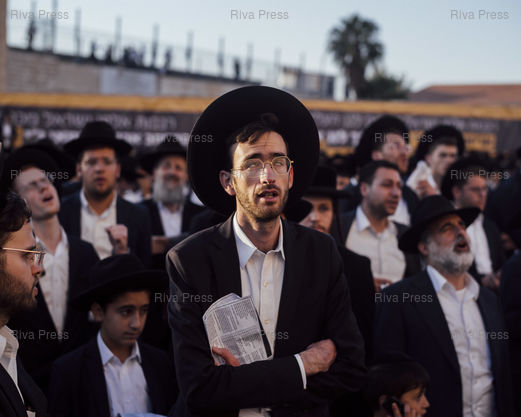 Légende : Prière collective lors du rassemblement de plusieurs centaines de milliers d'ultra-orthodoxes à Jérusalem pour protester contre le projet de loi les contraignant à la conscription militaire au sein de l'armée israélienne. Jérusalem, le 30 octobre 2025. © Lucien Lung / Riva Press *** Collective prayer during a gathering of several hundred thousand ultra-Orthodox Jews in Jerusalem to protest the Knesset bill that would force them into military service in the Israeli army. Jerusalem, October 30, 2025. © Lucien Lung / Riva Press