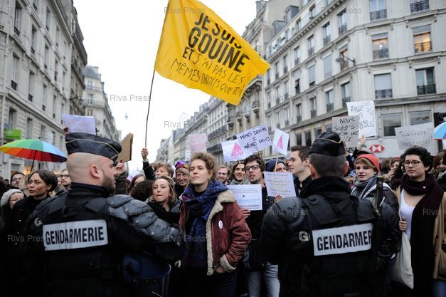 Des manifestants gays et lesbiennes manifestent au passage de la manif pour tous à Montparnasse - Paris - 17/11/2012 - Photo © Lionel Préau +33 (0)6 68 12 83 77