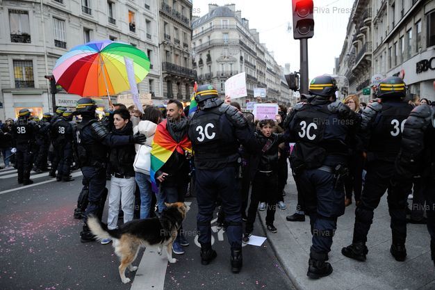 Des manifestants gays et lesbiennes manifestent au passage de la manif pour tous à Montparnasse - Paris - 17/11/2012 - Photo © Lionel Préau +33 (0)6 68 12 83 77