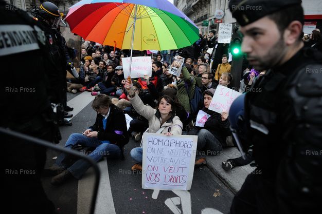 Des manifestants gays et lesbiennes manifestent au passage de la manif pour tous à Montparnasse - Paris - 17/11/2012 - Photo © Lionel Préau +33 (0)6 68 12 83 77