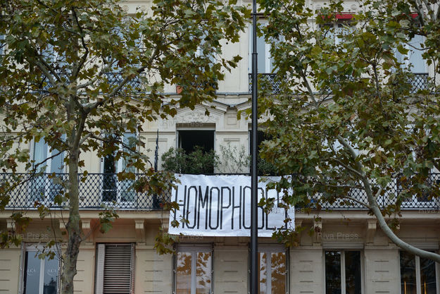 Une banderolle "homophobes" sur la facade d'un immeuble au passage de la manif pour tous à Montparnasse - Paris - 17/11/2012 - Photo © Lionel Préau +33 (0)6 68 12 83 77